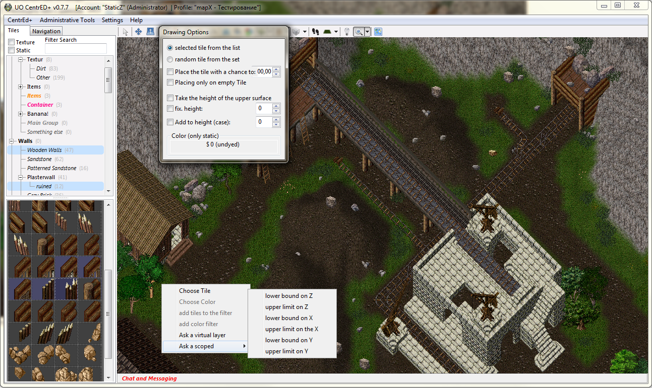 “CentrEd+” is the modified map and statics CentrEd editor of the last version 0.6.1 (by Andreas Schneider). Main advantages of “CentrEd+” are: better client data files support, group filtering for tiles, new tools, brushes, multi objects, runuo integration, updated and improved multi languageinterface, many other new features. The editor is the client-server application so it’s possible to edit and look through the maps for different people at the same time, besides the program allows to work with maps of any size. Originaly this modification was made espesially for the Quintessence server, but now after rather big work it’s able for all UO commnunity.