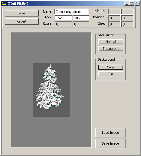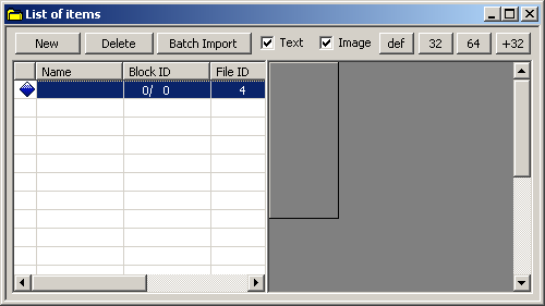 Name - Jméno itemu pro snadnější rozeznání pokud jich děláte víc najednou (nemá vliv na jméno ve hře). Block - ID itemu pod kterým ho chceme vložit. Levá hodnota je číslo v DEC soustavě, pravá v HEX soustavě. Draw mode, Background - Pomocí tlačítek můžeme zkontrolovat například transparentní barvu, zda vše souhlasí jak potřebujeme. Load Image - Nahrátí grafické podoby itemu. Save Image - Uložení grafické podoby itemu (hodí se, pokud máte na disku jen vytvořený projekt a nemáte k dispozici originální obrázek).