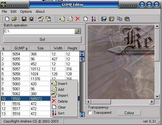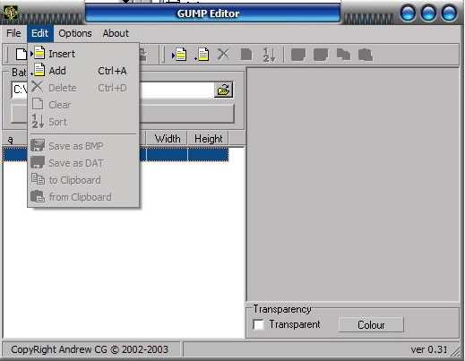 Insert, Add, Delete, Clear, Sort, Save as BMP, Save as DAT, to Clipboard, from Clipboard